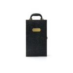 Kit vinho 4 peças em maleta de couro sintético texturizada. Contém saca-rolhas metálico, bico condutor com tampa, cortador de lacre e wine collar. Maleta com alça, trava de segurança e plaquinha plástica fixa. Área interna revestida de veludo com suportes de nylon com velcro e duas repartições para garrafas.
