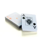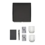 Kit para whisky e jogos. Conta com dois copos para whisky, baralho, caneta esferográfica e bloco para anotações.