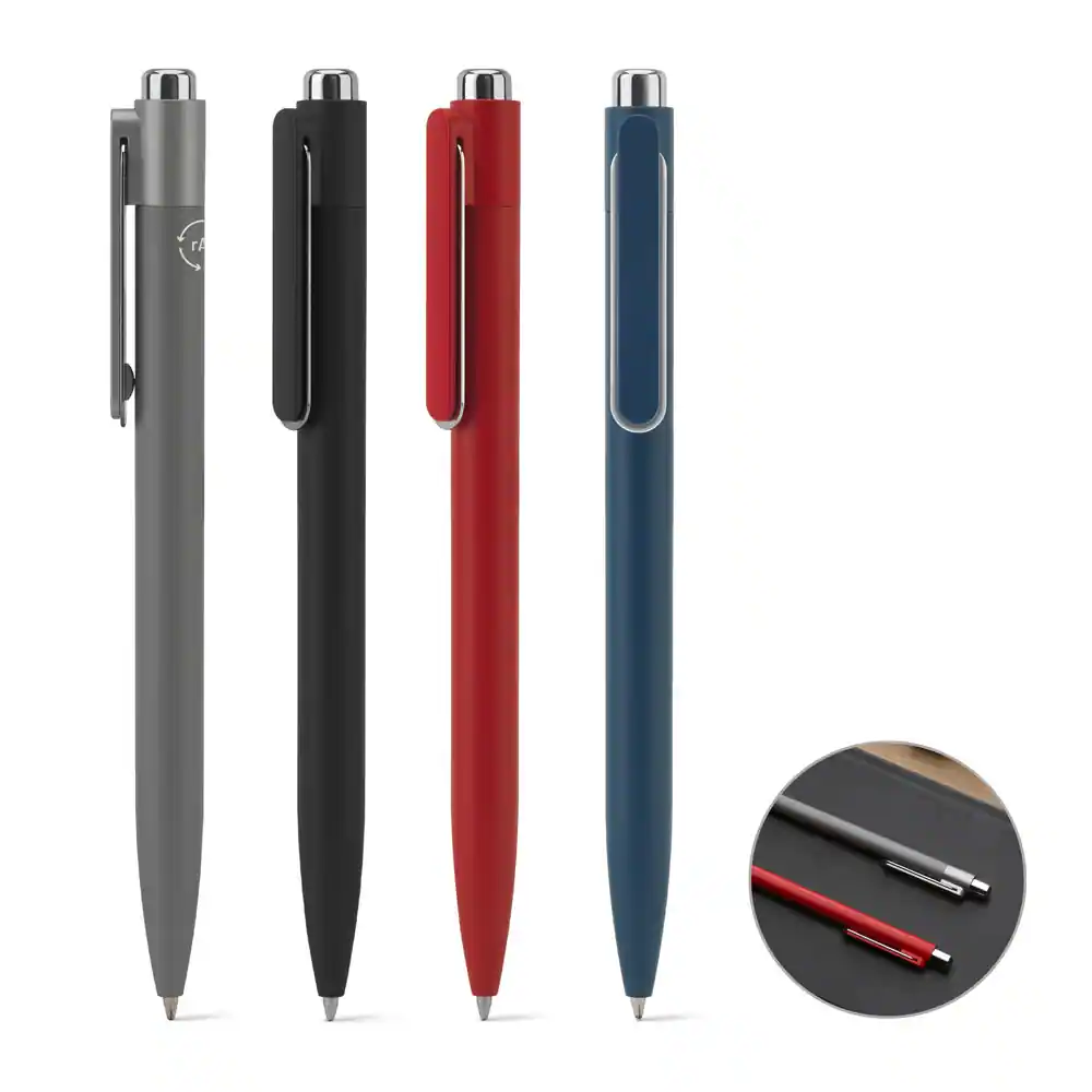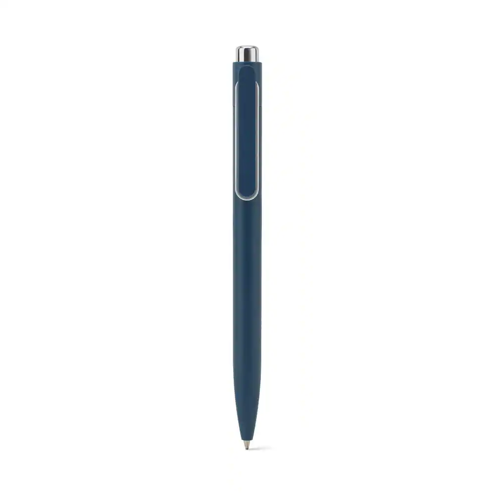 Esferográfica em alumínio 94% reciclado, com clipe em formato inovador que se evidência pela sua singularidade e elegância. Escrita em azul até 1.5 km. ø10 x 140 mm