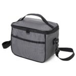 Bolsa térmica 6 litros com bolsos externos e alça de mão em nylon, contém bolso frontal aberto e bolso traseiro com zíper. Acompanha plaquinha metálica e alça transversal regulável com mosquetões para encaixe nas fivelas laterais da bolsa.
