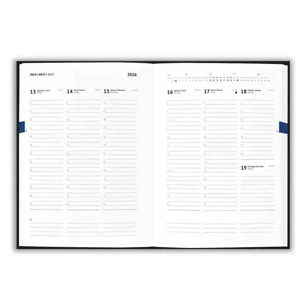Agenda B5 em PET reciclado (100% rPET). Possui suporte para esferográfica (não inclusa) e marcador em fita. Está organizada num plano semanal. Fornecida com bolsa de non-woven. 175 x 245 mm | Bolsa: 220 x 270 mm