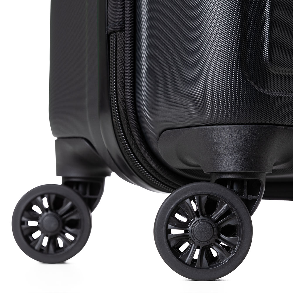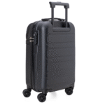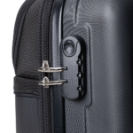 Mala viagem pequena em ABS e parte em plástico e detalhe em poliéster 600D com interior em poliéster 210D.