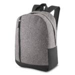 Mochila de poliéster com compartimento principal superior e compartimento frontal com abertura lateral. Contém um bolso de nylon na lateral, alça de mão em nylon e alças ajustáveis para as costas.