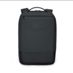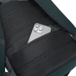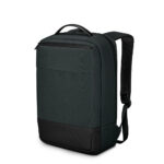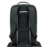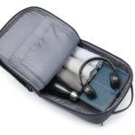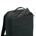 Mochila premium, produzida com poliéster 600D acolchoado e interior em 210D, alças de ombro acolchoadas, interior com divisórias com zíper para acomodar pequenos objetos, bolso frontal com zíper e na parte das costas uma divisória atrás, com engate para mala de viagem, aceita notebook de até 15,6”. Mochila resistente a água.