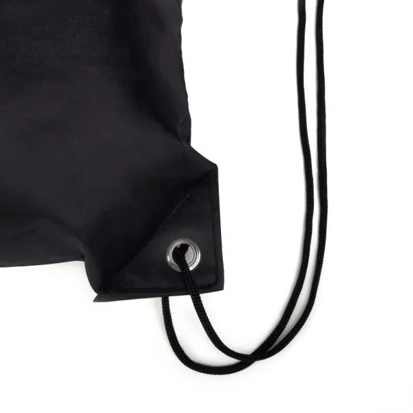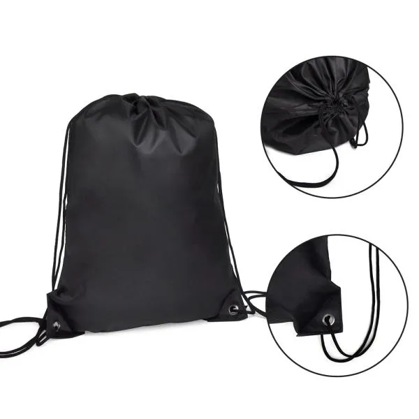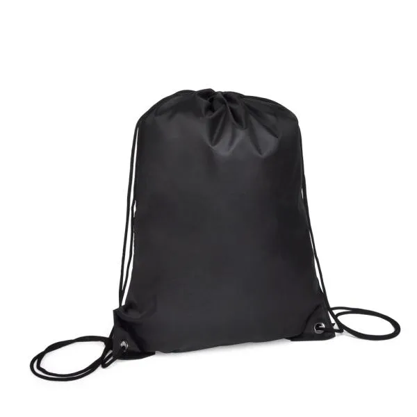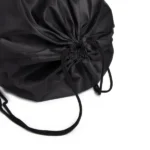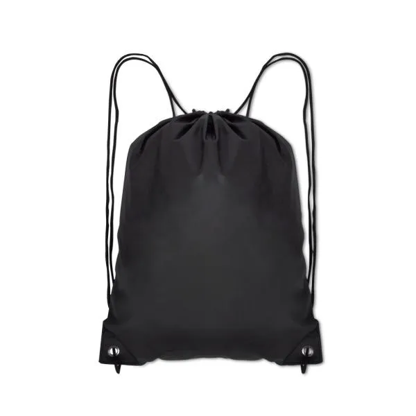 Mochila sacola preta em Nylon 190D com alças ajustáveis.