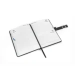 Agenda A5 em PU (58% reciclado), com fecho magné,tico e placa metálica. Possui um suporte para esferográfica (não inclusa) e um marcador em fita. Está organizada em plano diário. 148 x 212 mm