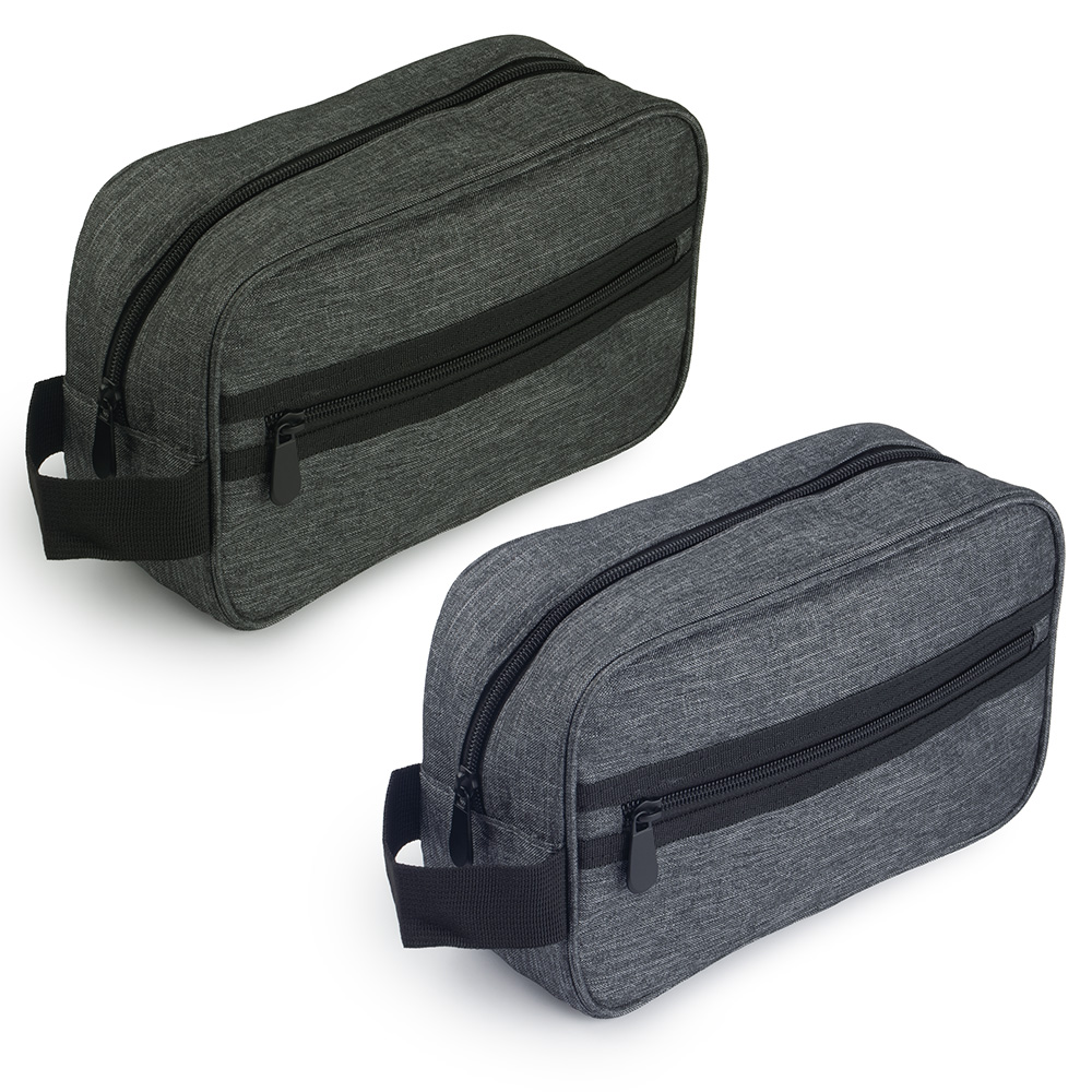 Nécessarie em tecido poliéster 300D, alça de mão e bolso externo com zíper.