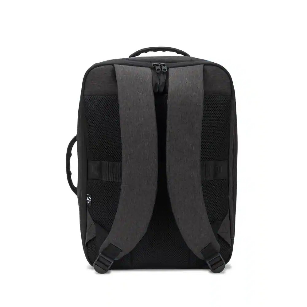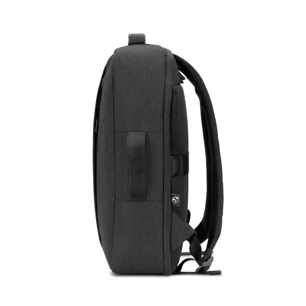Mochila para notebook em poliéster reciclado 300D de alta densidade e forro em poliéster reciclado 190T. Possui um compartimento principal para notebook até 15’6″ que pode ser totalmente aberto, possibilitando um acesso mais descomplicado, e um bolso frontal de grande dimensão. A mochila também pode ser utilizada como pasta graças à sua pega lateral e o seu formato compacto. A parte posterior em malha incorpora uma alça para trolley. Capacidade até 15 L. 300 x 410 x 110 mm