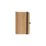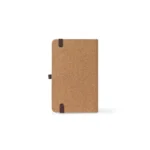 Caderno de bolso de capa dura em folha de bambu e cortiça. Contém 160 páginas, em papel 100% reciclado, pautadas cor de marfim, fita separadora, suporte para esferográfica (não inclusa) e elástico para fecho do caderno. 90 x 142 mm