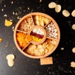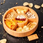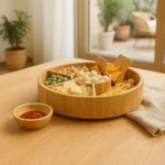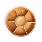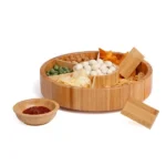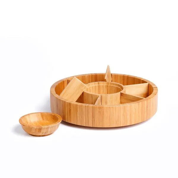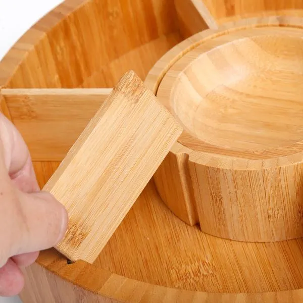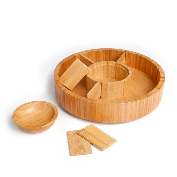 Petisqueira giratória em bambu. Conta com seis divisórias, com placas removíveis, e um bowl para molhos e patês.