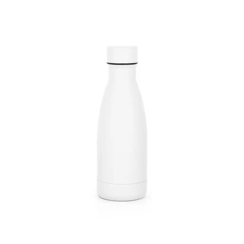 Garrafa térmica em aço inox 90% reciclado com parede dupla, isolada a vácuo e acabamento em mate. A tampa de rosca é à prova de vazamentos. Capacidade até 400 mL. Fornecido em caixa presente de papel kraft reciclado. Certificação EU Food Grade. ø70 x 210 mm