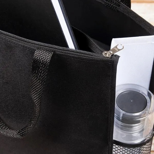 Conta com alça, tela lateral, compartimento duplo, sendo um com fechamento em zíper.