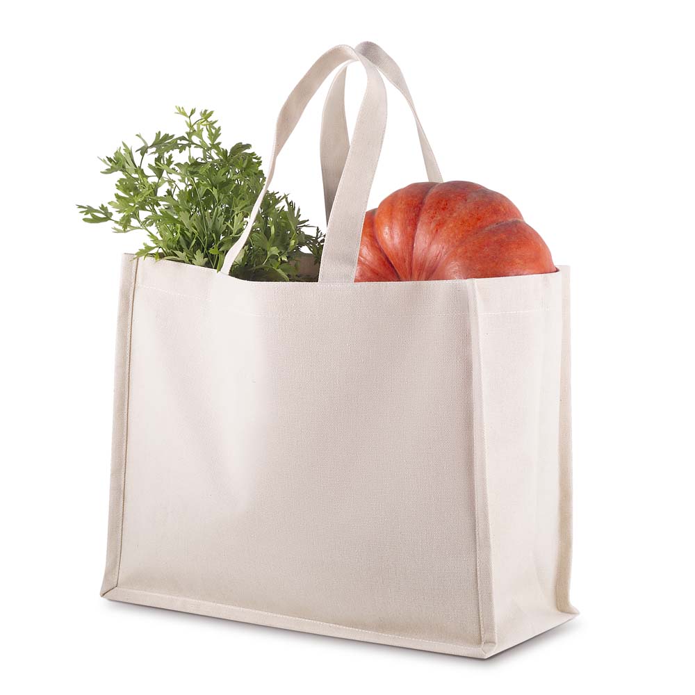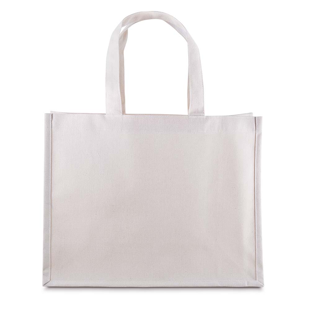 Sacola em Algodão Cru 220g/m², com base plana para maior estabilidade. Alça com altura de 17 cm, ideal para transporte.