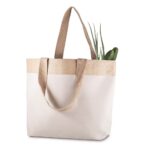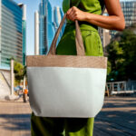 Sacola em Algodão Cru 220g/m² com detalhe em Juta. Alça com altura de 24 cm, ideal para transporte.