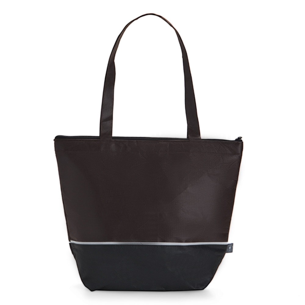 Sacola térmica de rPET com capacidade de 10 litros, contém fechamento com zíper.