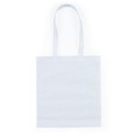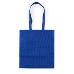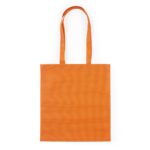 Sacola colorida com alça em material TNT, possui símbolo ecológico/reciclável na costura da alça.