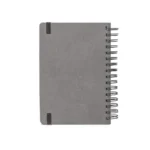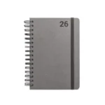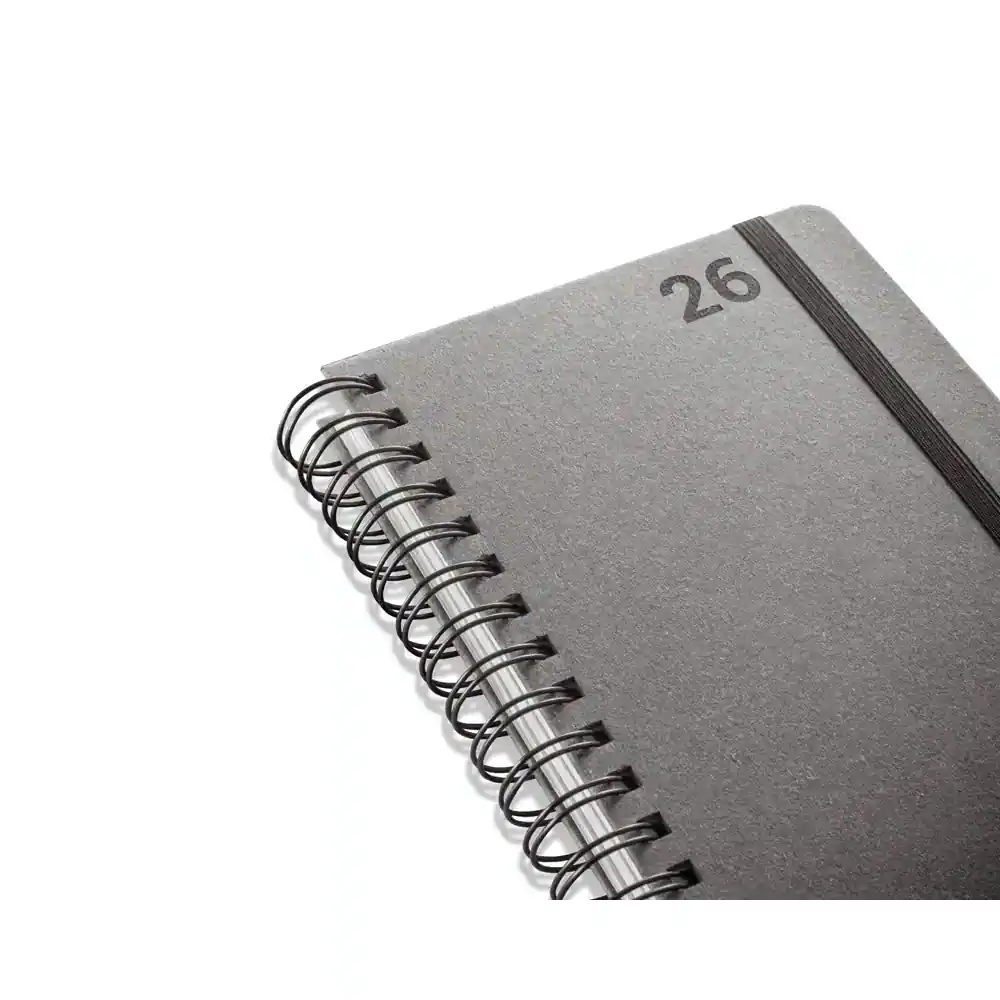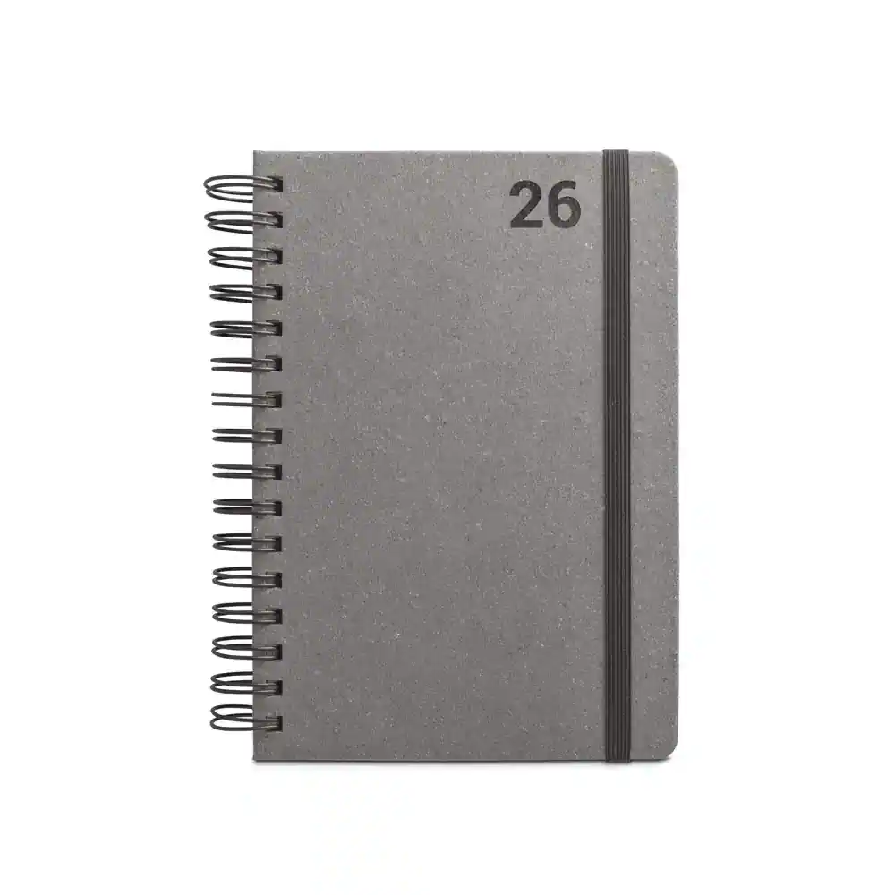 Agenda A5, com argolas, em pele (58% reciclada). Possui um elástico para fecho da agenda. Está organizada num plano diário. 148 x 210 mm