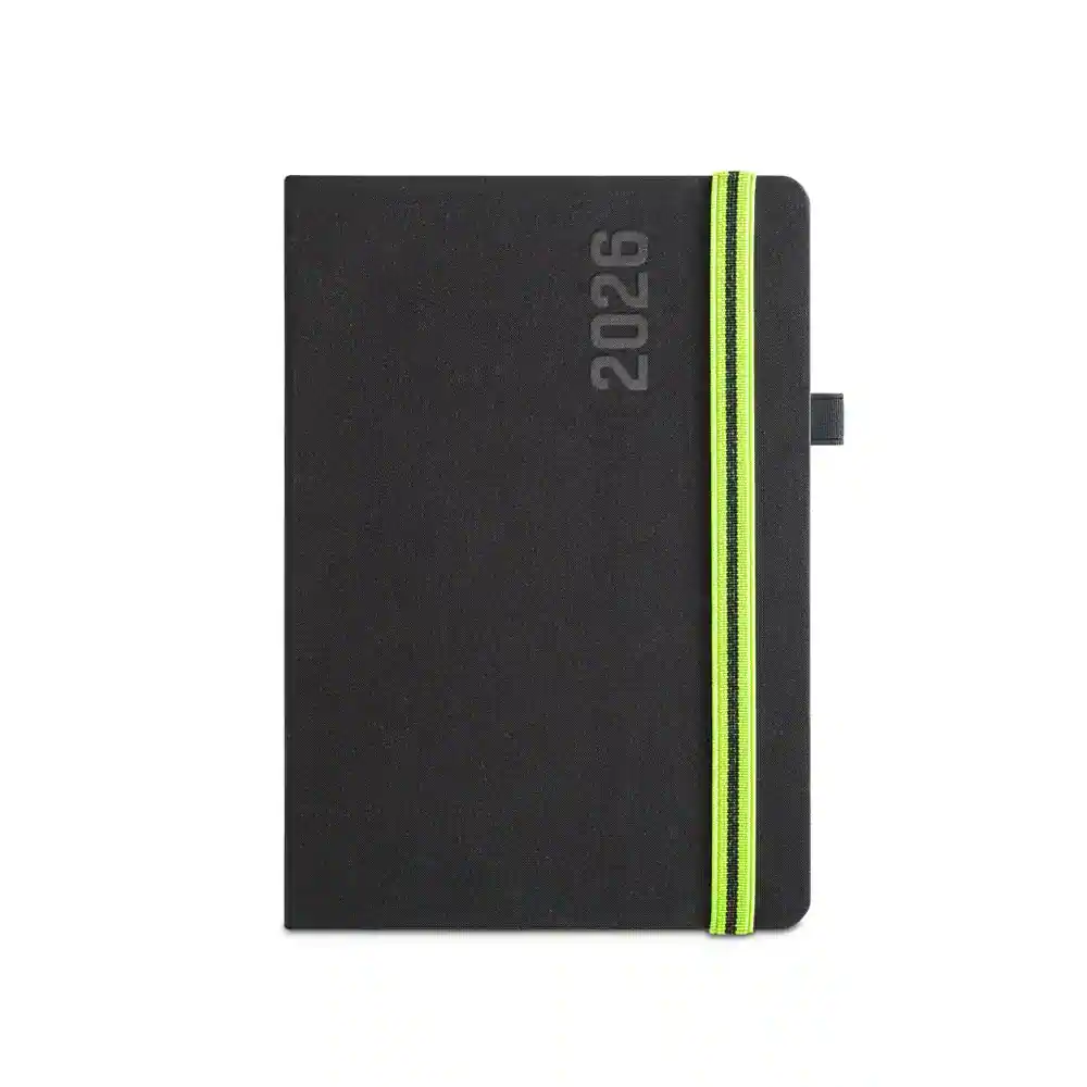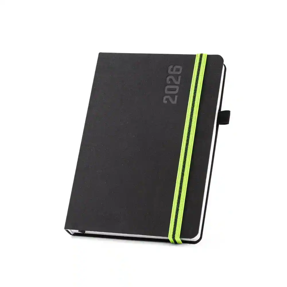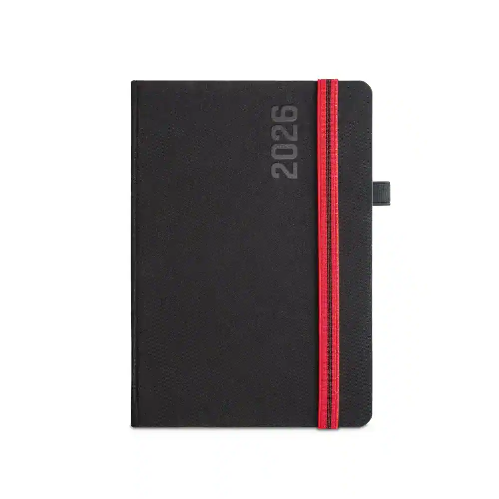 Agenda A5 em tecido polié,ster. Com suporte para esferográfica (não inclusa) e marcador em fita. Está organizada num plano diário. 145 x 212 mm