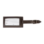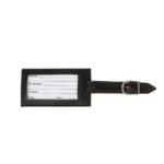Tag identificador de bagagem de couro sintético. Parte frontal com bolso de visor plástico e lado inverso liso, possui fivela prata com 3 tamanhos de encaixe.