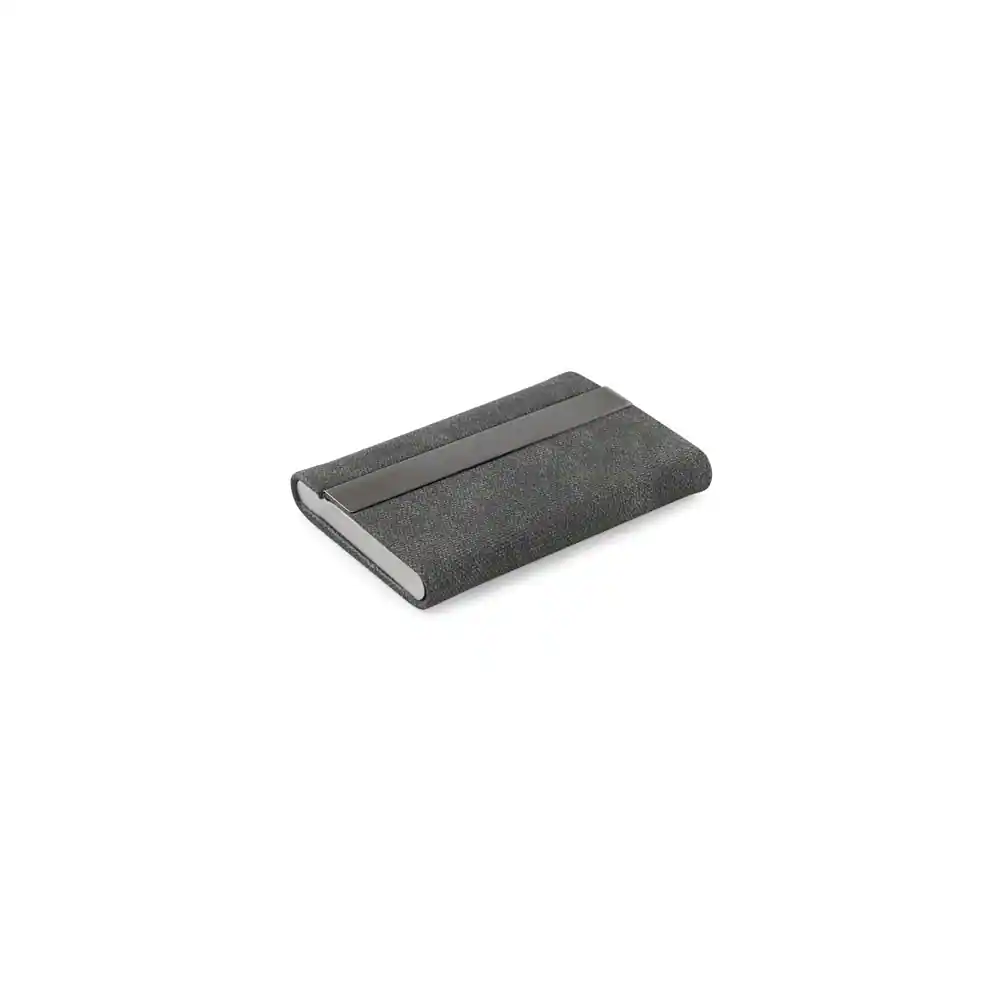 Conjunto composto por um porta-cartões e um chaveiro, ambos em metal e poliéster 30% reciclado. O porta-cartões tem capacidade até 7 cartões. Fornecido em caixa presente de papel kraft reciclado. Chaveiro: 25 x 115 x 6 mm | Porta-cartões: 95 x 65 x 15 mm | Caixa: 125 x 135 x 17 mm