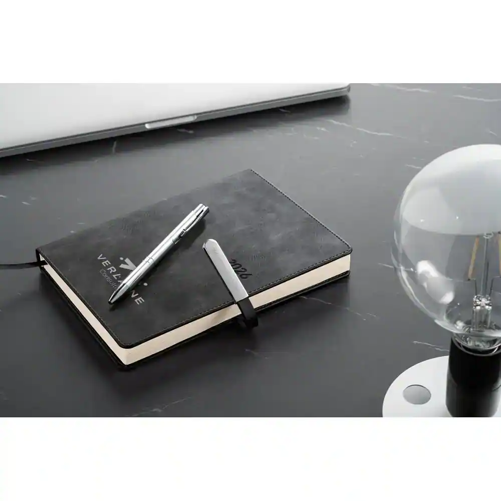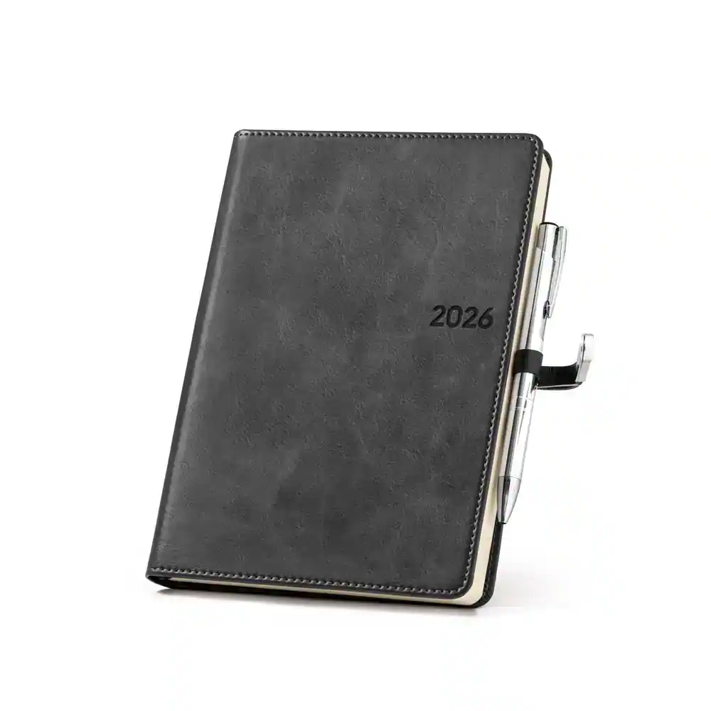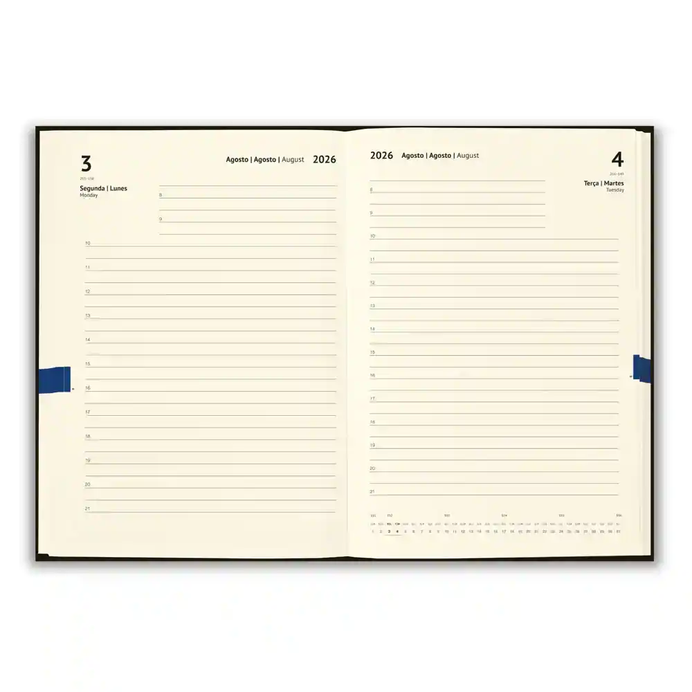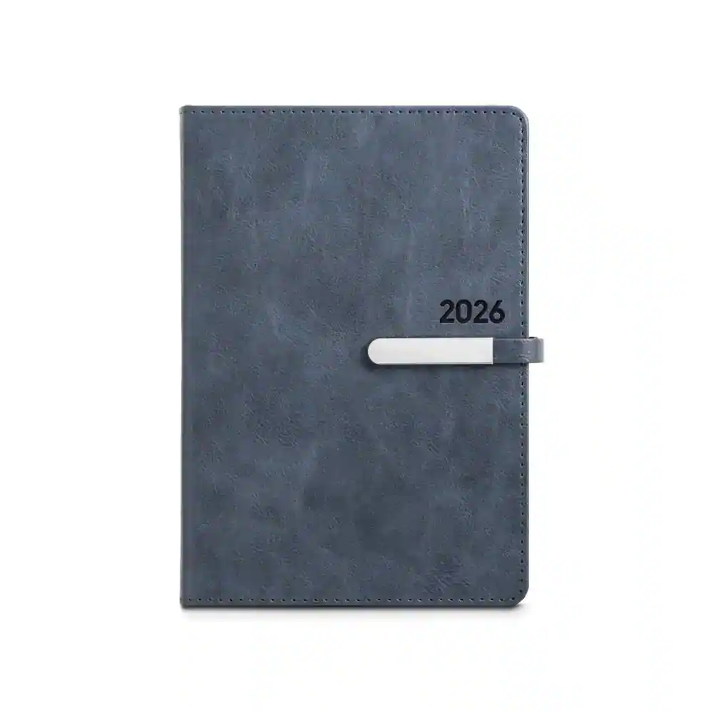Agenda B5 em PU, com fecho magné,tico e peça metálica brilhante. Possui um suporte para esferográfica (inclusa) e marcador em fita. Está organizada num plano diário. Fornecida com bolsa de non-woven. 148 x 210 mm | Bolsa: 205 x 250 mm
