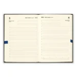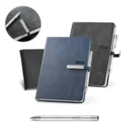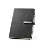 Agenda B5 em PU, com fecho magné,tico e peça metálica brilhante. Possui um suporte para esferográfica (inclusa) e marcador em fita. Está organizada num plano diário. Fornecida com bolsa de non-woven. 148 x 210 mm | Bolsa: 205 x 250 mm