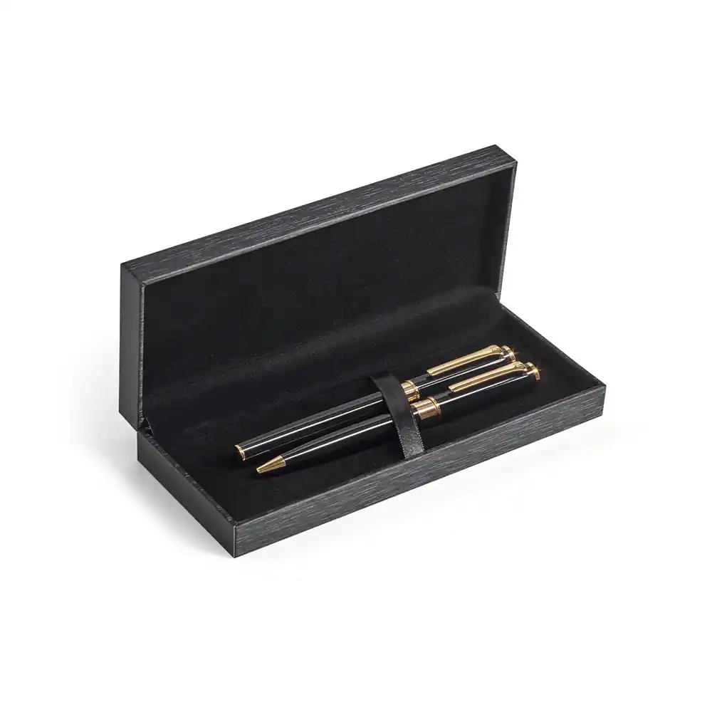 Conjunto de roller e esferográfica em metal. Elementos com banho de ouro de 18 quilates. Fornecido em estojo almofadado. ø12 x 136 mm | Estojo: 185 x 75 x 31 mm